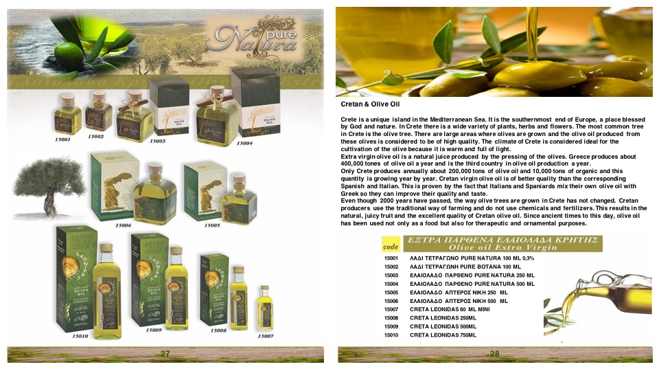 Our Greek products, with a wide range such as Extra Virgin Olive Oil, Olives, Honey, Cretan Herbs and Spices, old time sweets, botanical teas, Organic tea various flavors of rare beneficial relaxing, slimming, well being and stimulating tastes, pure Handmade Olive Oil soaps and Cosmetics from recipes that have passed from generation to generation for the famous Minoan Beauty only with Natural products. Many more, and all under the brand PURE NATURA, being the ambassadors of the Cretan gastronomic tradition, which are focused on Cretan diet, and aspires to create a New Philosophy of Nutrition.